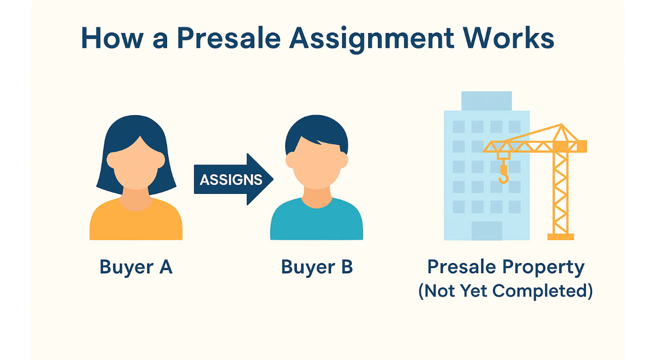 A presale assignment is when the original buyer of a presale condo (who purchased it directly from the developer) sells their contract to another buyer before the building is completed. The new buyer “assumes” the contract and becomes the new purchaser of the unit upon completion.